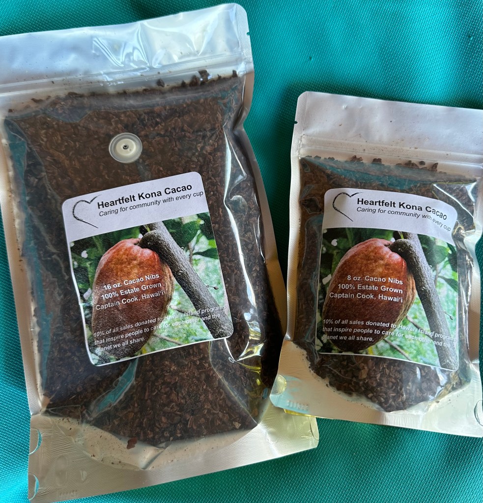Admittedly, our nibs are more expensive than some commercially sold nibs. Ours are estate-grown nibs, all grown on our Kona coffee farm, hand-picked, carefully processed, cleaned and packaged. Most chocolate and nibs are made from cacao beans grown in various tropical parts of the world and shipped for use to chocolatiers to process. That leaves many steps in the process to many farmhands and transport agents, some of which may not as quality-conscious as we are (we’ve seen goats wandering through sun-drying nibs in some places). They tend to produce mass quantities, using machines when possible to do the work. We do most of it by hand with great care to keep everything in the process clean and exact. And if we are careful we maybe earn about $10 an hour for our time. This is no get-rich scheme, but it’s good outdoor work and we love it. And we love to share our products with people who appreciate the taste of a good cup of coffee or hot chocolate or MOCHA!!!!